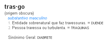 Trasgo é a palavra portuguesa, sobretudo usada na região de Trás-os-Montes, e entretanto caída em desuso, para duende, elf ou goblin em inglês ou lutin em francês.